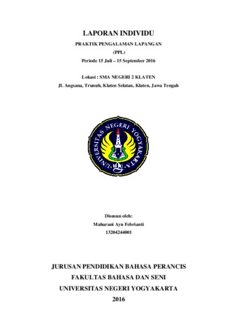 Maharani Ayu Febrianti, Maharani Ayu Febrianti (2016) Laporan Praktik Pengalaman Lapangan (PPL) Pendidikan Bahasa Perancis SMA Negeri 2 Klaten. Project Report. LPPMP, Universitas Negeri Yogyakarta.