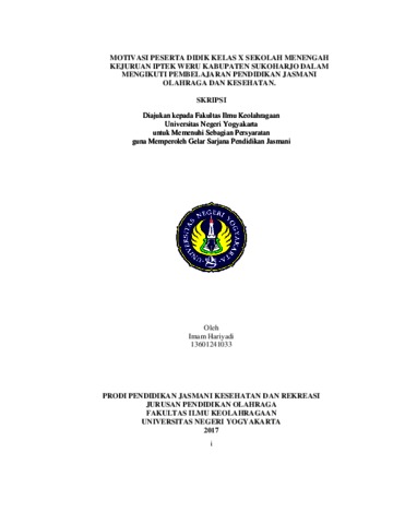 Hariyadi, Imam (2017) MOTIVASI PESERTA DIDIK KELAS X SEKOLAH MENENGAH KEJURUAN IPTEK WERU KABUPATEN SUKOHARJO DALAM MENGIKUTI PEMBELAJARAN PENDIDIKAN JASMANI OLAHRAGA DAN KESEHATAN. S1 thesis, Fakultas Ilmu Keolahragaan.