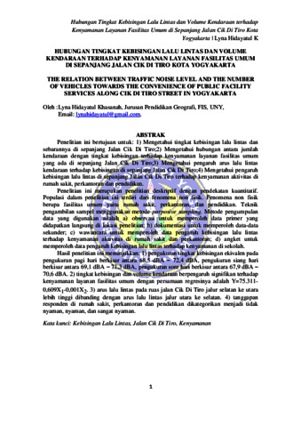 Lyna Hidayatul Khasanah, Lyna Hidayatul Khasanah (2017) HUBUNGAN TINGKAT KEBISINGAN LALU LINTAS DAN VOLUME KENDARAAN TERHADAP KENYAMANAN LAYANAN FASILITAS UMUM DI SEPANJANG JALAN CIK DI TIRO KOTA YOGYAKARTA. S1 thesis, FIS.