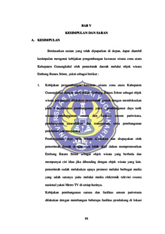 Nuri Hartono, Nuri Hartono (2017) KEBIJAKAN PENGEMBANGAN KAWASAN WISATA ZONA UTARA KABUPATEN GUNUNGKIDUL OLEH PEMERINTAH DAERAH MELALUI OBJEK WISATA EMBUNG BATARA SRITEN. S1 thesis, FIS.