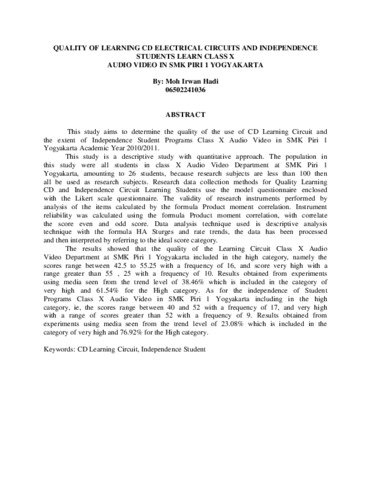 extent of Independence Student Programs Class X Audio Video in SMK Piri 1 Yogyakarta Academic Year 2010/2011. This study is a descriptive study with quantitative approach. The population in this study were all students in class X Audio Video Department at SMK Piri 1 Yogyakarta, amounting to 26 students, because research subjects are less than 100 then all be used as research subjects. Research data collection methods for Quality Learning CD and Independence Circuit Learning Students use the model questionnaire enclosed with the Likert scale questionnaire. The validity of research instruments performed by analysis of the items calculated by the formula Product moment correlation. Instrument reliability was calculated using the formula Product moment correlation, with correlate the score even and odd score. Data analysis technique used is descriptive analysis technique with the formula HA Sturges and rate trends, the data has been processed and then interpreted by referring to the ideal score category. The results showed that the quality of the Learning Circuit Class X Audio Video Department at SMK Piri 1 Yogyakarta included in the high category, namely the scores range between 42.5 to 55.25 with a frequency of 16, and score very high with a range greater than 55 , 25 with a frequency of 10. Results obtained from experiments using media seen from the trend level of 38.46% which is included in the category of very high and 61.54% for the High category. As for the independence of Student Programs Class X Audio Video in SMK Piri 1 Yogyakarta including in the high category, ie, the scores range between 40 and 52 with a frequency of 17, and very high with a range of scores greater than 52 with a frequency of 9. Results obtained from experiments using media seen from the trend level of 23.08% which is included in the category of very high and 76.92% for the High category. Keywords: CD Learning Circuit, Independence Student
