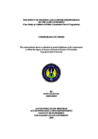 Yuliyana, Sani (2018) THE EFFECT OF FRAMING AND AUDITOR INDEPENDENCE ON THE AUDIT JUDGMENT (Case Study on Auditors in Public Accountant Firm of Yogyakarta). S1 thesis, Fakultas Ekonomi.