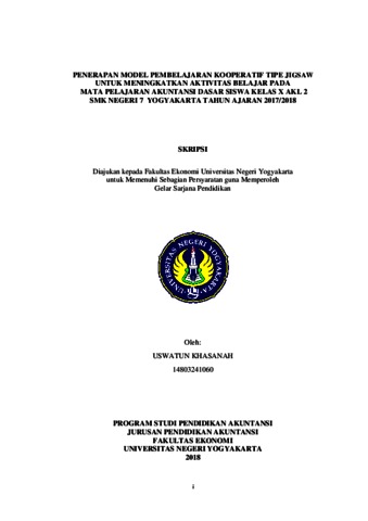 KHASANAH, USWATUN (2018) PENERAPAN MODEL PEMELAJARAN KOOPERATIF TIPE JIGSAW UNTUK MENINGKATKAN AKTIVITAS BELAJAR PADA MATA PELAJARAN AKUNTANSI DASAR SISWA KELAS X AKL 2 SMK NEGERI 7 YOGYAKARTA TAHUN AJARAN 2017/2018. S1 thesis, Fakultas Ekonomi UNY.