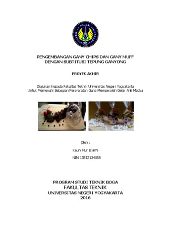 Islami, Kauni Nur (2016) PENGEMBANGAN GANY CHIPS DAN GANY MUFF DENGAN SUBTITUSI TEPUNG GANYONG. D3 thesis, Fakultas Teknik.