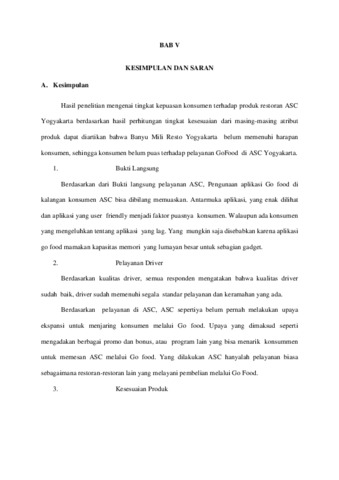 Penelitian ini bertujuan untuk mengetahui tingkat kepuasan konsumen di Angkringan, Steak & Chicken (ASC) Jalan Pandega Martha, berdasarkan lima atribut , yaitu : Bukti langsung aplikasi, pelayanan driver, service dari ASC, kesesuaian produk, kebersihan dan kemasan. Jenis Penelitian ini merupakan penelitian deskriptif kuantitatif, dengan populasi penelitian pengguna layanan Go Food di ASC sebanyak 900 orang. Pengambilan sampel dilakukan secara insidental, sehingga ditemukan sampel sejumlah 50 orang. Teknik pengambilan data dilakukan menggunakan kuesioner dan dokumentasi . Teknik analisis data yang digunakan adalah IPA (Index Performance Analysis) . Instrumen penelitian yang digunakan berbentuk kuesioner dengan 36 pertanyaan berdasarkan pada lima atribut yang diteliti. Hasil penelitian menunjukkan bahwa kepuasan konsumen yang diperoleh berdasarkan harapan dan kenyataan adalah: bukti aplikasi sudah puas. Berdasarkan pelayanan driver, sudah puas. Berdasarkan kesesuaian, produk sudah puas. Berdasarkan pelayanan belum puas. Berdasarkan kemasan dan kebersihan, belum puas.