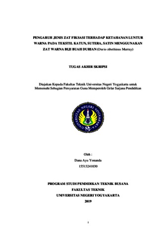 Yonanda, Dana Ayu (2019) PENGARUH JENIS ZAT FIKSASI TERHADAP KETAHANAN LUNTUR WARNA PADA TEKSTIL KATUN, SUTERA, SATIN MENGGUNAKAN ZAT WARNA BIJI BUAH DURIAN (Durio zibethinus Murray). S1 thesis, Universitas Negeri Yogyakarta.