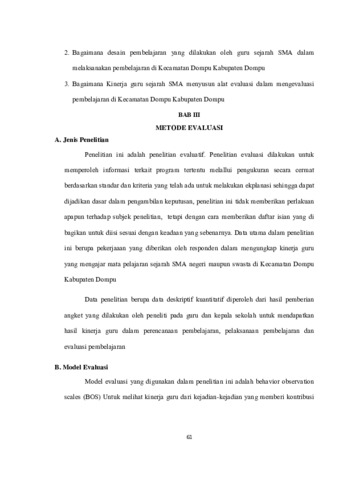 Penelitian ini bertujuan untuk mengetahui: (1) kinerja guru sejarah SMA di kecamatan Dompu Kabupaten Dompu dalam merencanaan proses pembelajaran (2) kinerja guru sejarah SMA di Kecamatan Dompu Kabupaten Dompu dalam pelaksanaan pembelajaran, (3) kinerja guru sejarah SMA di Kecamatan Dompu Kabupaten Dompu dalam mengevaluasi pembelajaran. Penelitian ini merupakan penelitian evaluasi, sampel penelitian yaitu 30. 5 orang kepala sekolah dan 25 guru mata pelajaran. Pengumpulan data menggunakan angket. Angket digunakan untuk mengngkapkan kinerja guru sejarah SMA di kecamatan Dompu Kabupaten. Validitas instrumen menggunakan korelasi Product Moment dan uji reliabilitas menggunakan Alpha Cronbach’s Hasil penelitian menunjukan (1) kinerja guru sejarah SMA di Kecamatan Dompu Kabupaten Dompu dalam perencanaan pembelajaran mendapatkan skor 3, 87 dengan kategori baik, 29 responden memilih baik, 1 responden memilih sangat baik sedangkan cukup baik, kurang baik dan tidak baik tidak ada yang memilih. (2) kinerja guru sejarah SMA di Kecamatan Dompu Kabupaten Dompu dalam pelaksanaan pembelajaran menunjukan skor 3,9 dengan kategori baik. 29 responden memilih baik, 1 responden memilih cukup baik sedangkan sangat baik, kurang baik dan tidak baik tidak ada yang memilih. (3) Kinerja guru sejarah SMA di Kecamatan Dompu Kabupaten Dompu dalam mengevaluasi pembelajaran menunjukan skor 3,96 dengan kategori baik. 27 responden memilih baik, 2 responden memilih sangat baik dan 1 responden memilih cukup baik sedangkan kurang baik dan tidak baik tidak ada yang memilih.