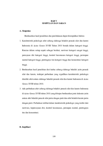 Penelitian ini bertujuan untuk mengetahui: (1) karakteristik psikologis atlet cabang olahraga beladiri pencak silat dan karate Indonesia di Asian Games XVIII Tahun 2018, (2) perbedaan karakteristik psikologis atlet olahraga beladiri pencak silat dan karate Indonesia di Asian Games XVIII, dan (3) perbedaan karakteristik psikologis atlet olahraga beladiri pencak silat dan karate Indonesia di tinjau dari jenis kelamin di Asian Games XVIII tahun 2018. Pendekatan penelitian ini adalah kuantitatif menggunakan metode survei dengan desain penelitian adalah a restrospective causal-comparative design disebut juga penelitian ex post facto. Populasi penelitian adalah atlet Indonesia cabang olahraga beladiri pencak silat dan karate yang bertanding di Asian Games XVIII tahun 2018 yang berjumlah 34 atlet terdiri dari 22 atlet olahraga beladiri pencak silat dan 12 olahraga beladiri karate. Pengumpulan data menggunakan kuesioner The Psychological Skills Inventory for Sports (PSIS). Teknik analisis data menggunakan analisis uji uji t yakni independent sample T Test dengan taraf signifikansi 0,05. Hasil penelitian ini menunjukkan bahwa: (1) karakteristik psikologis atlet olahraga beladiri pencak silat dan karate Indonesia di Asian Games XVIII berada dalam kategori tinggi dengan nilai rerata sebesar 155,29, (2) ada perbedaan karakteristik psikologis atlet antara olahraga beladiri pencak silat dan karate Indonesia di Asian Games XVIII dengan nilai α = p < 0,05, (3) ada perbedaan yang signifikan antara karakteristik psikologis atlet olahraga beladiri yang ditinjau dari jenis kelamin dengan nilai α = p < 0,05.