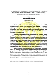 Penelitian ini bertujuan untuk: (1) Mengetahui pengaruh sikap praktik pembubutan dengan prestasi praktik pembubutan siswa SMK PIRI 1 Yogyakarta; (2) Mengetahui pengaruh motivasi praktik pembubutan dengan prestasi praktik pembubutan siswa SMK PIRI 1 Yogyakarta; (3) Mengetahui pengaruh sikap praktik pembubutan dan motivasi praktik terhadap prestasi praktik pembubutan siswa SMK PIRI 1 Yogyakarta. Penelitian ini merupakan deskriptif dengan pendekatan kunatitatif. Metode penelitian yang digunakan adalah metode ex-post facto. Data yang diperoleh merupakan data interval. Variabel dalam penelitian ini adalah sikap praktik dan motivasi praktik sebagai variabel bebas serta prestasi praktik pembubutan sebagai variabel terikat. Populasi penelitian ini adalah siswa kelas XI dan XII jurusan teknik pemesinan SMK PIRI 1 Yogyakarta, kemudian diambil sampel dengan menggunakan metode simple random sampling sebanyak 39 siswa. Pengumpulan data menggunakan metode kuesioner dan dokumentasi. Teknik analisis data yang digunakan adalah teknik analisis deskriptif dan teknik analisis regresi. Hasil penelitian ini mengemukakan bahwa (1) Sikap praktik berpengaruh positif dan signifikan terhadap prestasi praktik pembubutan dengan sumbangan pengaruh sebesar 37%; (2) Motivasi praktik berpengaruh positif dan signifikan terhadap prestasi praktik pembubutan dengan sumbangan pengaruh 30%; (3) Sikap praktik dan motivasi praktik secara bersama-sama berpengaruh positif dan signifikan terhadap prestasi praktik dengan sumbangan pengaruh sebesar 41%, dan persamaan regresi Y = 46,141 + 0,365.X₁ + 0,183.X₂