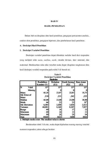 Penelitian ini bertujuan untuk: (1) mengetahui Peranan perhatian orang tua dalam pendidikan karakter anak usia dini; (2) mengatahui peranan kasih sayang orang tua dalam pendidikan karakter anak usia dini; (3) mengetahui peranan rasan aman dalam pendidikan karakter anak usia dini; (4) mengetahui peranan perhatian orang tua, kasih sayang orang tua dan rasa aman dalam pendidikan karakter anak usia dini 5-6. Metode yang digunakan dalam penelitian adalah penelitian ex-post facto dan data dianalisis dengan analisis regresi ganda. Populasi dalam penelitian ini adalah orang tua dan anak di Taman Kanak-kanak kota Bima. Sampel dari populasi yang diambil sebanyak 2 kecamatan yaitu kecamatan Rasa Nae Barat dan kecamata Punda yang terdiri dari 157 Perhatian Orang Tua, 157 Kasih Sayang Orang Tua, dan 157 Rasa Aman Anak. Data diperoleh melalui angket dan observasi di lapangan, artinya angket digunakan untuk mengukur peranan orang tua perhatian, kasih sayang dan rasa aman anak sedangkan observasi digunakan untuk mengukur pendidikan karakter anak usia dini. pengukuran diperoleh melalui skor penilaian dari angket dan observasi di peroleh melalui hasil pengamatan. Kemudian data dianalisis dengan teknik tertentu yakni: (1) Statistik Deskriptif dan (2) Statistik Inferensial dengan analisis regresi ganda. Hasil analisis deskriptif membuktikan bahwa peranan perhatian orang tua, kasih sayang orang tua dan rasa aman anak di kecamatan Rasa Nae Barat dan kecamata Punda berada dalam kategori sangat baik. Dan juga pendidikan karakter anak usia dini dalam kategori sangat baik. Jadi hasil analisis peranan perhatian orang tua yang signifikan sebesar 0,570 terhadap pendidikan karakter anak usia dini. Peranan kasih sayang orang tua berpengaruh signifikan dalam pendidikan karakter anak sebesar 0,572. Sedangkan analissi rasa aman anak sebesar 0,453. Uji regresi ganda menunjukan bahwa ada pengaruh yang sangat sebesar 30,618 antara peranan perhatian orang tua, kasih sayang dan rasa aman dalam pendidikan karakter anak usia dini. Hasil ini membuktikan bahwa peranan perhatian orang tua, kasih sayang dan rasa aman berpengaruh secara langsung terhadap pendidikan karakter anak usia dini.