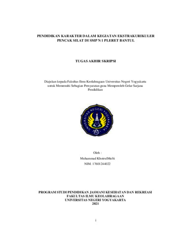 Mufti, Muhammad Khoirul (2021) PENDIDIKAN KARAKTER DALAM KEGIATAN EKSTRAKURIKULER PENCAK SILAT DI SMP N 1 PLERET BANTUL. S1 thesis, Fakultas Ilmu Keolahragaan.