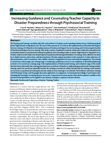 Handaka, Irvan Budhi and Saputra, Wahyu Nanda Eka and Septikasari, Zela (2022) Increasing guidance and counseling teacher capacity in disaster preparedness through psychosocial training. PEGEGOG, 12 (1566). pp. 242-248. ISSN Vol. 12 No. 1 (2022)