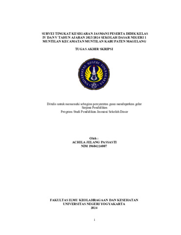 Passasti, Achila Jelang (2024) Survei Tingkat Kesegaran Jasmani Peserta Didik Kelas IV dan V Tahun Ajaran 2023/2024 Sekolah Dasar Negeri 1 Muntilan Kecamatan Muntilan Kabupaten Magelang. S1 thesis, Fakultas Ilmu Keolahragaan dan Kesehatan.
