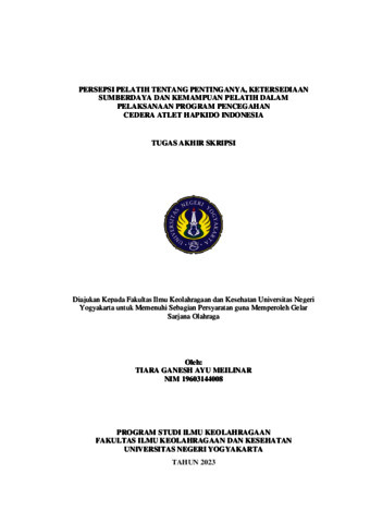 Meilinar, Tiara Ganesh Ayu (2024) Persepsi Pelatih Tentang Pentingnya, Ketersediaan Sumberdaya Dan Kemampuan Pelatih Dalam Pelaksanaan Program Pencegahan Cedera Atlet Hapkindo Indonesia. S1 thesis, Fakultas Ilmu Keolahragaan dan Kesehatan.