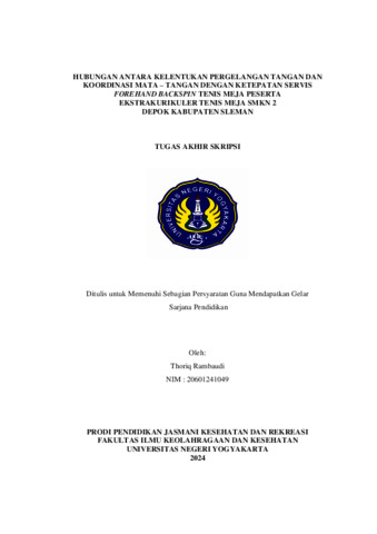 Rambaudi, Thoriq (2024) Hubungan Antara Kelentukan Pergelangan Tangan dan Koordinasi Mata – Tangan Dengan Ketepatan Servis Forehand Backspin Tenis Meja Peserta Ekstrakurikuler Tenis Meja SMKN 2 Depok Kabupaten Sleman. S1 thesis, Fakultas Ilmu Keolahragaan dan Kesehatan.