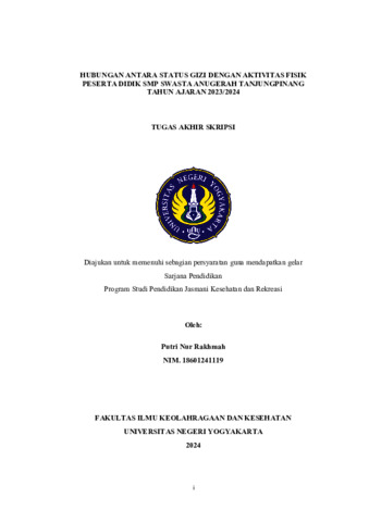 Rakhmah, Putri Nur (2024) Hubungan Antara Status Gizi dengan Aktivitas Fisik Peserta Didik SMPS Anugerah Tanjungpinang Tahun Ajaran 2023/2024. S1 thesis, Fakultas Ilmu Keolahragaan dan Kesehatan.