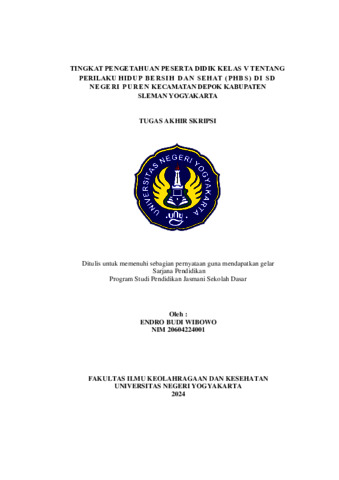 Wibowo, Endro Budi (2024) Tingkat Pengetahuan Peserta Didik Kelas V Tentang Perilaku Hidup Bersih dan Sehat (PHBS) di SD Negeri Puren Kecamatan Depok Kabupaten Sleman Yogyakarta. S1 thesis, Fakultas Ilmu Keolahragaan dan Kesehatan.