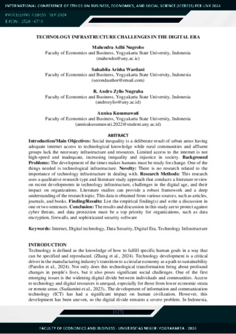 Adhi Nugroho, Mahendra and Arisha Wardani, Salsabila and Zylio Nugraha, R. Andro and Kusumawati, Annisa TECHNOLOGY INFRASTRUCTURE CHALLENGES IN THE DIGITAL ERA. International Conference of Ethics on Business, Economics, and Social Science (ICEBESS), 2024 (1). ISSN 2528-671X