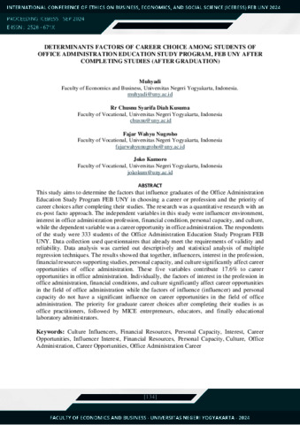 Muhyadi, Muhyadi and Syarifa Diah Kusuma, Rr Chusnu and Wahyu Nugroho, Fajar and Kumoro, Joko DETERMINANTS FACTORS OF CAREER CHOICE AMONG STUDENTS OF OFFICE ADMINISTRATION EDUCATION STUDY PROGRAM, FEB UNY AFTER COMPLETING STUDIES (AFTER GRADUATION). International Conference of Ethics on Business, Economics, and Social Science (ICEBESS), 2024 (1). ISSN 2528-671X