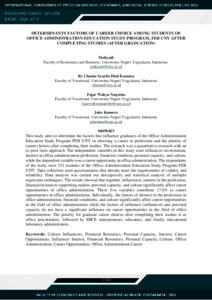 This study aims to determine the factors that influence graduates of the Office Administration Education Study Program FEB UNY in choosing a career or profession and the priority of career choices after completing their studies. The research was a quantitative research with an ex-post facto approach. The independent variables in this study were influencer environment, interest in office administration profession, financial condition, personal capacity, and culture, while the dependent variable was a career opportunity in office administration. The respondents of the study were 333 students of the Office Administration Education Study Program FEB UNY. Data collection used questionnaires that already meet the requirements of validity and reliability. Data analysis was carried out descriptively and statistical analysis of multiple regression techniques. The results showed that together, influencers, interest in the profession, financial resources supporting studies, personal capacity, and culture significantly affect career opportunities of office administration. These five variables contribute 17.6% to career opportunities in office administration. Individually, the factors of interest in the profession in office administration, financial conditions, and culture significantly affect career opportunities in the field of office administration while the factors of influence (influencer) and personal capacity do not have a significant influence on career opportunities in the field of office administration. The priority for graduate career choices after completing their studies is as office practitioners, followed by MICE entrepreneurs, educators, and finally educational laboratory administrators. Keywords: Culture Influencers, Financial Resources, Personal Capacity, Interest, Career Opportunities, Influencer Interest, Financial Resources, Personal Capacity, Culture, Office Administration, Career Opportunities, Office Administration Career