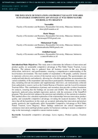 Nasruddin, Nasruddin and Maupa, Haris and Toaha, Muhammad and Sanusi, Abdullah THE INFLUENCE OF INNOVATION AND PRODUCT QUALITY TOWARDS SUSTAINABLE COMPETITIVE ADVANTAGE AT WAI-TIDDO NATURE TOURISM, LUWU REGENCY. International Conference of Ethics on Business, Economics, and Social Science (ICEBESS), 2024 (1). ISSN 2528-671X