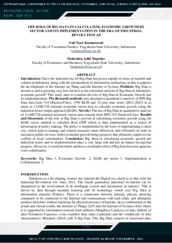 Noor Kusumawati, Yuli and Adhi Nugroho, Mahendra THE ROLE OF BIG DATA IN CALCULATING ECONOMIC GROWTH BY SECTOR AND ITS IMPLEMENTATION IN THE ERA OF INDUSTRIAL REVOLUTION. International Conference of Ethics on Business, Economics, and Social Science (ICEBESS), 2024 (1). ISSN 2528-671X