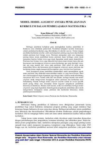 Berbagai perubahan kebijakan guna meningkatkan kualitas pendidikan di Indonesia terus dilakukan pemerintah. Perubahan kebijakan tersebut diantaranya adalah perubahan kurikulum yang diberlakukan di sekolah saat ini. Terkait dengan perubahan kurikulum tersebut, salah satu komponen penting yang hasus diperhatikan adalah penilaian hasil belajar siswa. Penilaian merupakan salah satu komponen penting dalam sistem pendidikan karena penilaian dapat berfungsi selain untuk memantau kualitas belajar siswa juga dapat digunakan untuk tujuan akuntabilitas. Penilaian hasil belajar siswa yang akuntabel dan akurat dapat dicapai hanya jika ada kesesuaian atau kesejajaran (aligment) antara kurikulum, apa yang dipelajari siswa, dan apa yang muncul dari siswa pada penilaian. Oleh sebab itu perlu untuk memastikan bahwa ada kesesuaian atau kesejajaran (aligment) antara penilaian dan kurikulum dalam rangka memperoleh kesimpulan yang valid dari hasil penilaian. Studi kesejajaran dalam pendidikan dimaksudkan untuk menunjukkan sejauh mana penilaian yang dilakukan mencerminkan standar isi yang harus dicapai. Hasil dari studi kesejajaran dapat digunakan juga sebagai bukti validitas untuk mendukung interpretasi skor siswa. Selama lebih dari satu dekade, berbagai metode atau model aligment untuk mengevaluasi kesejajaran antara penilaian dan kurikulum terus berkembang. Namun berbagai model aligment tersebut selama ini secara spesifik masih jarang dikaji atau diterapkan dalam kegiatan pengukuran pendidikan khususnya di Indonesia. Melalui studi literatur, artikel ini membahas berbagai model alignment yang dapat digunakan dalam kegiatan pengukuran pendidikan yakni untuk mengevaluasi kesejajaran antara penilaian dan kurikulum khususnya dalam pembelajaran matematika. Kata Kunci: Model Aligment antara Penilaian dan Kurikulum, Matematika