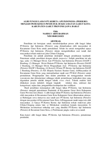 Nahdly, Abdurahman (2013) ALIH FUNGSI LAHAN PT.KERETA API INDONESIA (PERSERO) MENJADI PEMUKIMAN PENDUDUK DI KECAMATAN GARUT KOTA KABUPATEN GARUT PROVINSI JAWA BARAT. S1 thesis, Fakultas Ilmu Sosial.