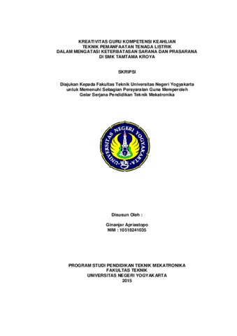 KREATIVITAS GURU KOMPETENSI KEAHLIAN TEKNIK PEMANFAATAN TENAGA LISTRIK DALAM MENGATASI KETERBATASAN SARANA DAN PRASARANA DI SMK TAMTAMA KROYA Oleh : Ginanjar Apriastopo NIM 10518241035 ABSTRAK Penelitian ini bertujuan untuk mengetahui kreativitas guru dalam mengatasi keterbatasan sarana dan prasarana kompetensi keahlian teknik pemanfaatan tenaga listrik, berdasarkan faktor kemampuan melihat masalah, faktor kemampuan menciptakan sebagai pemecahan masalah dan faktor kemampuan menciptakan gagasan berbeda untuk meninjau masalah. Penelitian ini merupakan penelitian deskriptif kuantitatif. Subyek penelitian ini adalah guru kompetensi keahlian teknik pemanfaatan tenaga listrik yang mengajar di SMK Tamtama Kroya yang berjumlah enam orang guru. Pengambilan data yang dilakukan dengan teknik pengamatan langsung dengan instrumen menggunakan lembar observasi. Hasil penelitian menunjukkan bahwa kreativitas guru kompetensi keahlian teknik pemanfaatan tenaga listrik dalam mengatasi keterbatasan sarana dan prasarana di SMK Tamtama Kroya tergolong cukup dengan persentase 57%. Kreativitas guru dilakukan dengan memodifikasi beberapa alat serta memperbaiki kerusakan yang ada. Berdasarkan faktor kemampuan melihat masalah didapat tingkat kreativitas guru tergolong kurang dengan persentase 48,6% yang ditunjukan adanya kreativitas guru dalam melihat masalah keterbatasan, berdasarkan faktor kemampuan menciptakan ide-ide didapat tingkat kreativitas guru tergolong cukup dengan persentase 70,2% yang ditunjukan adanya kreativitas guru dalam memodifikasi alat dalam mengatasi keterbatasan, berdasarkan faktor menciptakan gagasan berbeda didapat tingkat kreativitas guru tergolong kurang dengan persentase 52,2% yang ditunjukan adanya kreativitas guru dalam memberi arahan-arahan kepada siswa dalam mengatasi keterbatasan. Kata kunci: kreativitas,deskriptif kuantitatif, keterbatasan, guru, tingkat kreativitas.