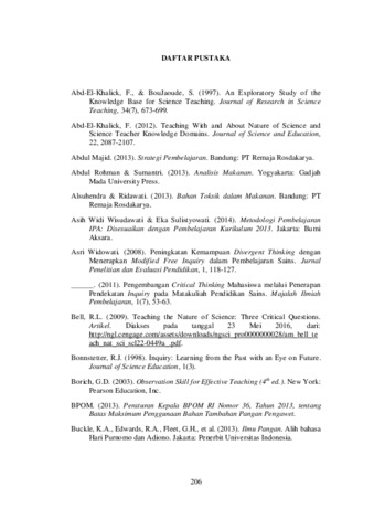 Penelitian ini bertujuan untuk mengetahui kelayakan LKPD IPA bermuatan Nature of Science (NOS) yang telah dikembangkan. Tujuan lainnya adalah mengetahui peningkatan literasi sains peserta didik setelah menggunakan LKPD IPA tersebut. Jenis penelitian ini adalah penelitian dan pengembangan. Prosedur penelitian dan pengembangan diadaptasi dari model 4-D yang meliputi tahap define (pendefinisian), design (perancangan), develop (pengembangan), dan disseminate (penyebarluasan). Penelitian ini dilaksanakan di SMP N 2 Mlati, Kabupaten Sleman. Subjek uji coba dalam penelitian ini adalah peserta didik kelas VIII D tahun pelajaran 2016/2017 yang berjumlah 29 orang. Instrumen yang digunakan dalam penelitian ini meliputi lembar validasi LKPD IPA, lembar observasi keterlaksanaan pembelajaran IPA bermuatan NOS, lembar angket respon peserta didik terhadap LKPD IPA, dan soal pretest serta posttest literasi sains. Teknik analisis data kelayakan LKPD IPA dan respon peserta didik terhadap LKPD IPA adalah konversi skor kuantitatif menjadi nilai kualitatif dengan lima kategori, teknik analisis data keterlaksanaan pembelajaran IPA bermuatan NOS adalah perhitungan persentase, sedangkan teknik analisis data skor pretest dan posttest literasi sains adalah paired sample t-test dan perhitungan gain score ternormalisasi (n-gain score). Hasil penelitian ini menunjukkan bahwa LKPD IPA bermuatan NOS layak digunakan dalam pembelajaran IPA berdasarkan hasil penilaian dosen ahli dan guru IPA. Kategori kelayakan LKPD IPA tersebut menurut dosen ahli dan guru IPA masing-masing adalah sangat baik (A). Selain itu, hasil penelitian juga menunjukkan bahwa literasi sains peserta didik mengalami peningkatan secara signifikan setelah menggunakan LKPD IPA bermuatan NOS. Peningkatan literasi sains peserta didik tersebut berada dalam kategori tinggi dengan n-gain score sebesar 0,71. Kata Kunci: LKPD, IPA, Nature of Science (NOS), Literasi Sains, Peserta Didik SMP This study aims to find out the appropriateness of science student worksheet containing nature of science that has been developed. It also aims to find out the improvement of students’ scientific literacy after using the worksheet. This study is research and development. The research and development procedure adapted the 4-D model which includes the steps of define, design, develop, and disseminate. The research was conducted at SMP N 2 Mlati, Sleman District. Subject of this research and development were 29 students of the class VIII D in the school year 2016/2017. The instruments of this research and development include validation sheet of science student worksheet, observation sheet of the implementation of science learning containing NOS, questionnaire sheet of students responses to the worksheet, and scientific literacy pretest and posttest. The data analysis technique of the appropriateness of science student worksheet and students responses to the worksheet is quantitative score conversion to qualitative value with five categories, the data analysis technique of the implementation of science learning containing NOS is a percentage calculation, while the data analysis techniques of scientific literacy pretest and posttest’s score are paired sample t-test and normalized gain score (n-gain score) calculation. The result of this study shows that science student worksheet containing NOS is appropriate to be used for science learning according to the assessment of expert lecturers and science teachers. The appropriateness category of the science student worksheet based on the assessment of expert lecturers and science teachers is very well (A). Futhermore, the result of this study also shows that students’ scientific literacy improve significantly after using the worksheet. The improvement of students’ scientific literacy is in the high category with n-gain score of 0,71.