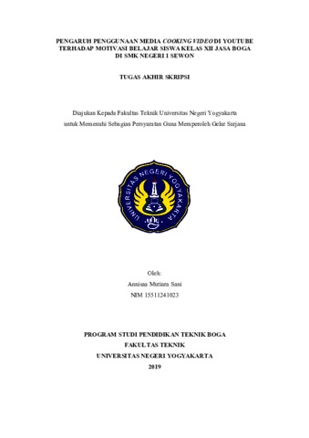 Sani, Annisaa Mutiara (2019) PENGARUH PENGGUNAAN COOKING VIDEO DI YOUTUBE TERHADAP MOTIVASI BELAJAR SISWA KELAS XII JASA BOGA SMK NEGERI 1 SEWON. S1 thesis, Universitas Negeri Yogyakarta.