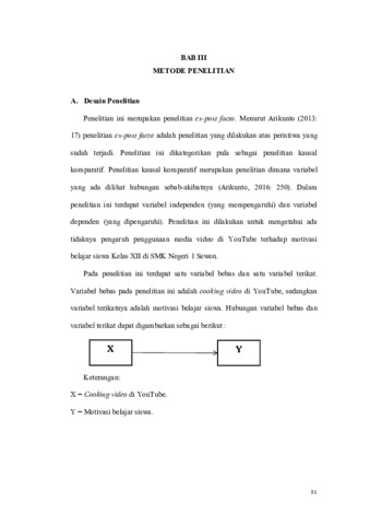 Penelitian ini bertujuan untuk mengetahui: (1) penggunaan media cooking video di Youtube pada siswa kelas XII Jasa Boga SMK N 1 Sewon pada mata pelajaran Pastry dan Bakery, (2) motivasi belajar siswa kelas XII Jasa Boga SMK N 1 Sewon pada mata pelajaran Pastry dan Bakery, (3) pengaruh cooking video di Youtube terhadap motivasi belajar siswa kelas XII Jasa Boga SMK N 1 Sewon pada mata pelajaran Pastry dan Bakery. Penelitian ini merupakan penelitian Ex-post Facto yang dilaksanakan dari bulan Juli 2018 - Agustus 2019. Populasi penelitian adalah siswa kelas XII Tata Boga di SMK Negeri 1 Sewon Tahun Pelajaran 2018/2019 yang berjumlah 187 siswa. Teknik pengambilan sampel yang digunakan adalah teknik simple random sampling dengan menggunakan tabel Isaac Michael dan taraf signifikansi 5%, sehingga diperoleh sampel penelitian sebanyak 126 siswa. Metode pengumpulan data menggunakan angket dengan Skala Likert. Uji validitas isi menggunakan rumus Product Moment menunjukkan bahwa 35 butir soal valid dari 38 butir soal. Adapun pada uji reliabilitas instrumen menggunakan Cronbach Alpha dengan nilai 0,618 dan 0,685 menunjukkan bahwa instrumen reliabel. Persyaratan analisis terdiri dari uji normalitas dengan One Sample Kolmogorov-Smirnov test dan uji linieritas data menggunakan uji F. Hipotesis diuji dengan uji korelasi Product Moment menggunakan program SPSS versi 24. Hasil penelitian menunjukkan bahwa: (1) penggunaan media Cooking Video dari Youtube pada siswa kelas XII Jasa Boga SMK N 1 Sewon pada mata pelajaran Pastry dan Bakery pada katagori tinggi sebanyak 51,6% dan rendah sebanyak 48,4%, (2) Motivasi belajar siswa kelas XII Jasa Boga SMK N 1 Sewon pada mata pelajaran Pastry dan Bakery pada kategori tinggi sebanyak 93,7%, dan pada kategori rendah 6,3%, (3) terdapat pengaruh positif penggunaan Cooking Video di YouTube terhadap Motivasi Belajar Siswa Kelas XII Jasa Boga di SMK Negeri 1 Sewon. Hal ini ditunjukkan dengan hasil koefisien korelasi (r) sebesar 0,359 dengan koefisien determinasi (r2) 0,128 yang berarti Cooking Video di YouTube memberikan pengaruh terhadap Motivasi Belajar Siswa.