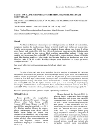 Arethusa, Kharisma and Ariyanti, Nur Aeni (2020) ISOLASI DAN KARAKTERISASI BAKTERI PROTEOLITIK DARI LIMBAH CAIR INDUSTRI TAHU. Universitas Negeri Yogyakarta.