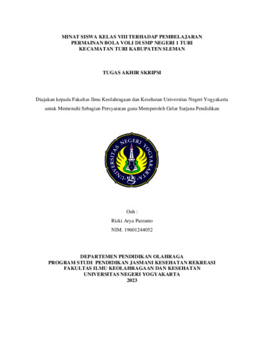 Putranto, Rizki Arya (2023) Minat Siswa Kelas VIII Terhadap Pembelajaran Permainan Bola Voli di SMP Negeri 1 Turi Kecamatan Turi Kabupaten Sleman. S1 thesis, Fakultas Ilmu Keolahragaan dan Kesehatan.